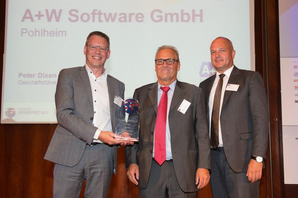 Die A+W-Software GmbH wurde als bestes Unternehmen in der Kategorie „Service und Beratung“ mit dem hessischen Exportpreis 2017 ausgezeichnet. Die Ehrung erfolgte durch den hessischen Wirt-schaftsminister Tarek Al-Wazir bei einem Festakt in der Industrie- und Handelskammer Frankfurt.