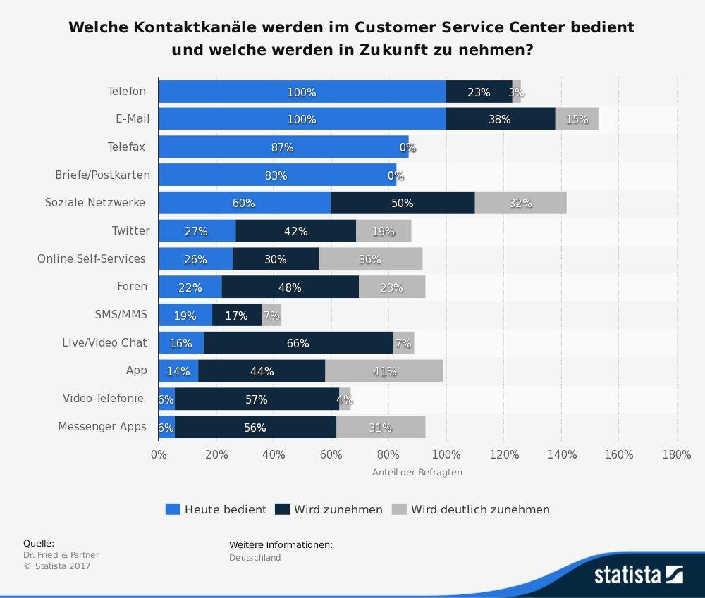 Ein Bestandteil der Kommunikation mit dem Kunden ist beispielsweise das Aufnehmen von Bestellungen. Die abgebildete Statistik (2015) [3] beschäftigt sich mit den Kontaktkanälen der deutschen Customer Service Center. Dort werden sowohl Kundenanfragen beantwortet als auch Bestellungen entgegengenommen. Lediglich für zwei Medien scheinen die befragten Unternehmen zukünftig weder ein Wachstum noch einen Rückgang zu prognostizieren: Briefe/Postkarten und Fax.