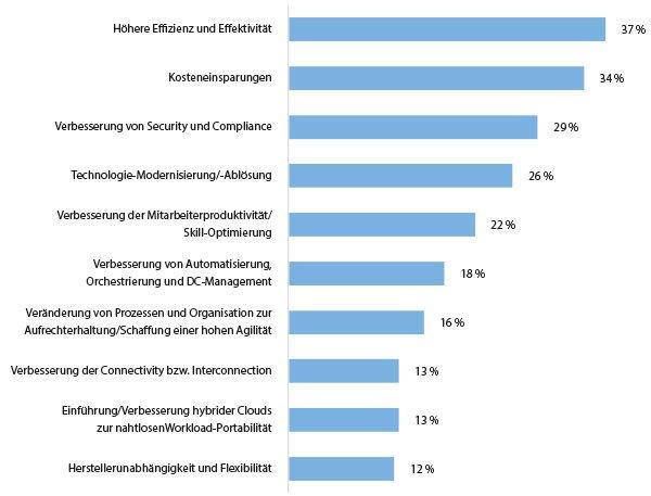 Eine höhere Effizienz und Effektivität der IT-Ressourcen steht für 37 Prozent der befragten Unternehmen ganz oben auf der Agenda. Damit benennen die IT-Entscheider klar den grundlegenden Engpass der IT-Infrastruktur in der Digitalisierung.