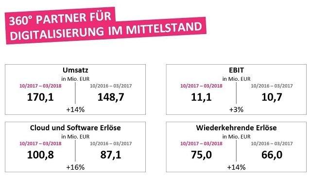 »Die hohe Dynamik bei den Cloud und Software Erlösen dürfte weiter anhalten. Daher haben wir unsere Jahresprognose für 2017/18 umsatzseitig leicht angehoben und rechnen nunmehr mit Gesamterlösen zwischen 325 Mio. und 335 Mio. EUR, zuvor waren wir von einem Umsatz zwischen 315 Mio. und 325 Mio. EUR ausgegangen. Unsere EBIT-Prognose für 2017/18 ist unverändert und liegt weiterhin im Bereich von 20,5 Mio. bis 22,0 Mio. EUR«, bekräftigt Land.