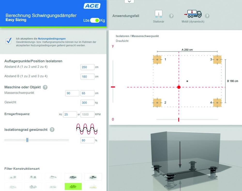 Nach Eingabe weniger Eckdaten ermöglicht das Programm die Wahl zwischen mehreren alternativen, hochwirksamen Produkten für die Schwingungsdämpfung und zeigt die jeweiligen Typen aus den ACE Produktfamilien unter der Maschine platziert grafisch an. Egal, ob Konstrukteure z. B. auf der Suche nach robusten Maschinenfüßen, Konuslagern für Fahrzeugkabinen oder Topfelementen sind, welche die von Generatoren verursachten Vibrationen isolieren, die Software ermittelt, welche Schwingungsdämpfer von ACE am besten zu den eingegebenen Werten passen und ermöglicht dann deren Bestellung über den ACE Online-Shop. Falls Anwender nicht fündig werden, sind alternativ die Experten von ACE nach wenigen Mausklicks mit Rat und Tat zur Stelle.