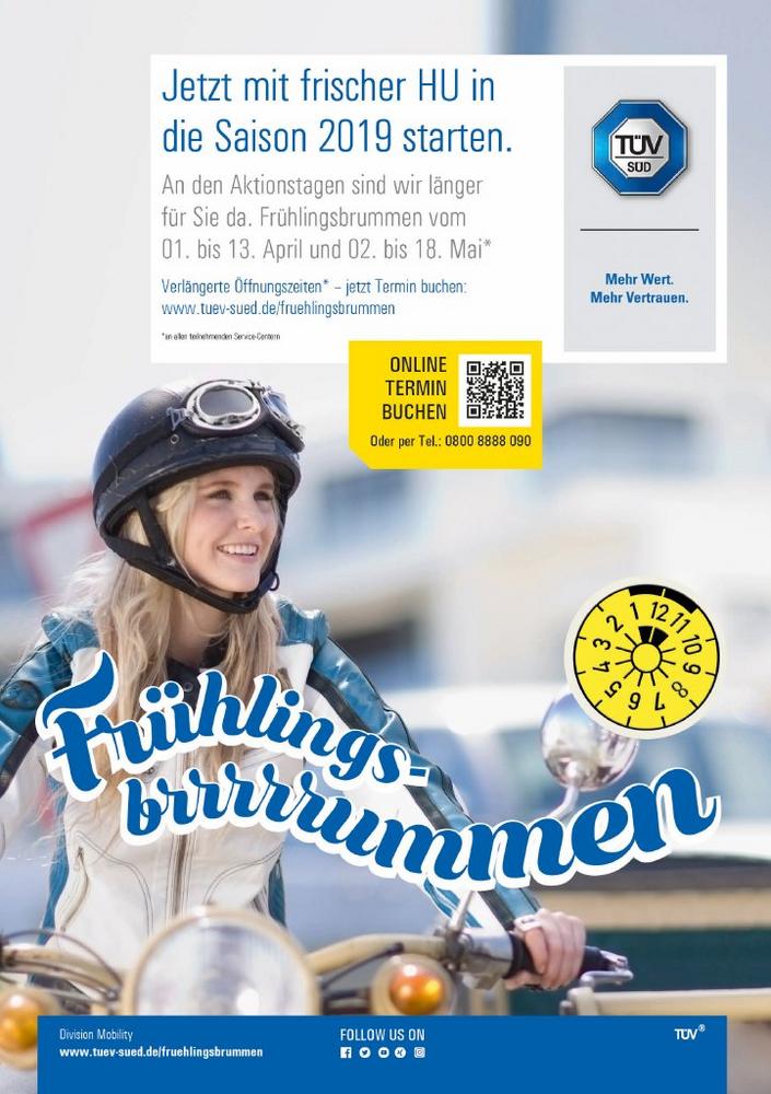 Kann ich mit einer abgelaufenen Plakette noch fahren oder muss ich doch erst zum TÜV? Auch Saisonfahrzeuge wie Cabrios, Motorräder oder Oldtimer müssen regelmäßig zur Hauptuntersuchung (HU). Ist die obere Zahl auf der orangefarbenen 19er-Plakette eine eins, zwei, drei oder vier, oder ist sogar noch eine grüne 2018er-Plakette auf dem Saisonkennzeichen, heißt es: Vor dem Start in den mobilen Frühling steht die Hauptuntersuchung. Denn sonst drohen unter Umständen Bußgelder oder sogar ein Wegfall des Versicherungsschutzes. Deshalb gibt es zum Saisonauftakt vom 1. bis 13. April und noch einmal vom 2. bis 18. Mai einen besonderen Service. Unter dem Motto „Frühlingsbrummen“ haben dann viele TÜV SÜD Service-Center länger geöffnet.