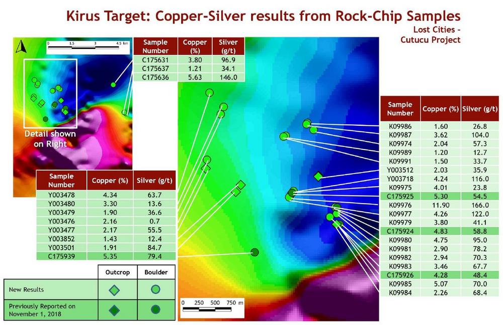 Denn bei der Erkundung der Kupfer-Silber-Mineralisierung auf diesem Teilbereich, der sich ebenfalls innerhalb des unternehmenseigenen ‚Lost Cities‘-Projekt in Ecuador befindet, wurden Felsbrocken in Bächen identifiziert, die bis zu 11,9 % Cu und 166 g/t Ag enthalten. Die daraufhin eingeleiteten Folgeuntersuchungen haben wiederum neue Entdeckungen gemacht, wozu auch eine Mineralisierung mit 5,1 % Cu und 70 g/t Ag in sporadischen Aufschlüssen über einen 2 km langen Trend unmittelbar nordwestlich des magnetischen Merkmals ‚Kirus‘ zählt.