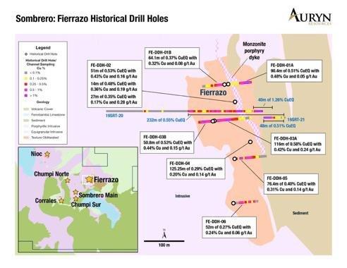 Der größte Teil der historischen Bohrungen im Zielgebiet ‚Fierrazo‘ durchschnitt die Kupfer-Gold-Mineralisierung innerhalb der kalkhaltigen Sedimente der ‚Upper Mara‘-Formation, da der Großteil des ‚Ferrobamba‘-Kalksteins in diesem Zielgebiet abgetragen wurde.