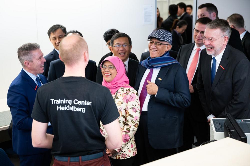 Yacob und ihre Delegation, darunter Bildungsminister Ong Ye Kung, wurden von Hans-Georg Krabbe, Dr. Chunyuan Gu, Chef von ABB Asien, Uwe Laudenklos, Leiter Geschäftsbereich Elektrifizierungsprodukte ABB Deutschland und Marcus Braunert, Geschäftsführer der ABB-Ausbildungszentren in Heidelberg und Berlin, empfangen und durch das ABB Training Center geführt.