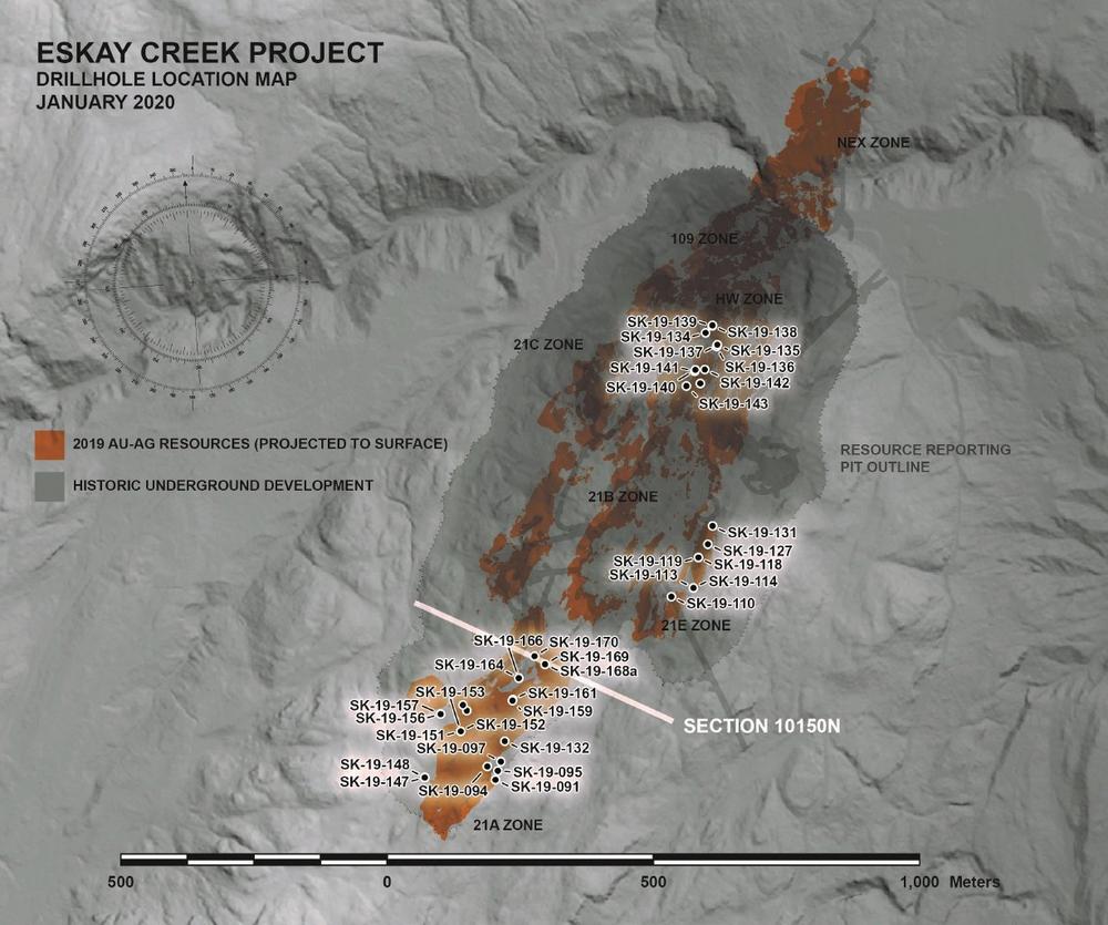 2019 Die Phase-I-Bohrungen innerhalb der Zone 21A liefern weiterhin sowohl höhere Au-Ag-Gehalte als auch Mächtigkeiten als erwartet. Das neueste Infill-Bohrloch SK-19-170 durchschnitt 10,14 g/t Au, 345 g/t Ag (14,73 g/t AuÄq.) auf 36,85 m (siehe beigefügter Abschnitt). Dieses Bohrloch wurde ursprünglich konzipiert, um das Vertrauen in die abgeleiteten Ressourcen zu erhöhen; der Abschnitt hat jedoch sowohl höhere Gehalte als auch größere Mächtigkeiten als die umgebenden historischen Bohrlöcher festgestellt. Zum Vergleich: Das nächstgelegene historische Bohrloch CA89-078 durchschnitt nur 7,16 g/t AuÄq. auf 16,71 m.