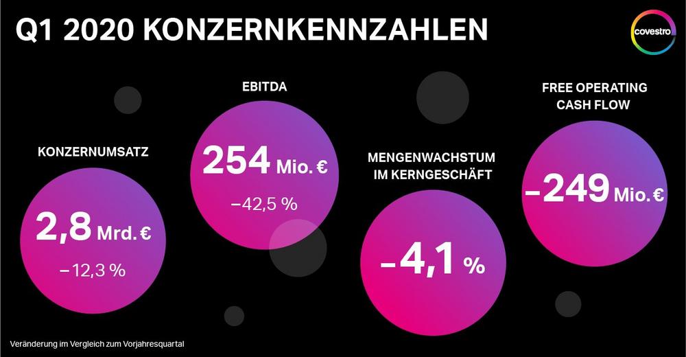 Covestro hat seine EBITDA-Prognose für das erste Quartal 2020 in einem durch die Auswirkungen des Coronavirus stark beeinträchtigten Geschäftsumfeld erreicht. Die abgesetzten Mengen im Kerngeschäft sanken um 4,1 % gegenüber dem Vorjahresquartal. Dies ist im Wesentlichen auf eine signifikant schwächere Nachfrage in China durch coronavirusbedingte Produktionsunterbrechungen im Februar und März 2020 bei dortigen Kunden zurückzuführen. Zusammen mit einem weltweiten Rückgang der Verkaufspreise, hauptsächlich getrieben durch erhöhten Wettbewerbsdruck in den Segmenten Polyurethanes und Polycarbonates, führte dies zu einem gesunkenen Konzernumsatz in Höhe von rund 2,8 Mrd. Euro (– 12,3 %). Das EBITDA lag mit 254 Mio. Euro (– 42,5 %) im erwarteten Bereich für das erste Quartal. Das Konzernergebnis sank auf 20 Mio. Euro (– 88,8 %). Der Free Operating Cash Flow (FOCF) war mit – 249 Mio. Euro erwartungsgemäß negativ.