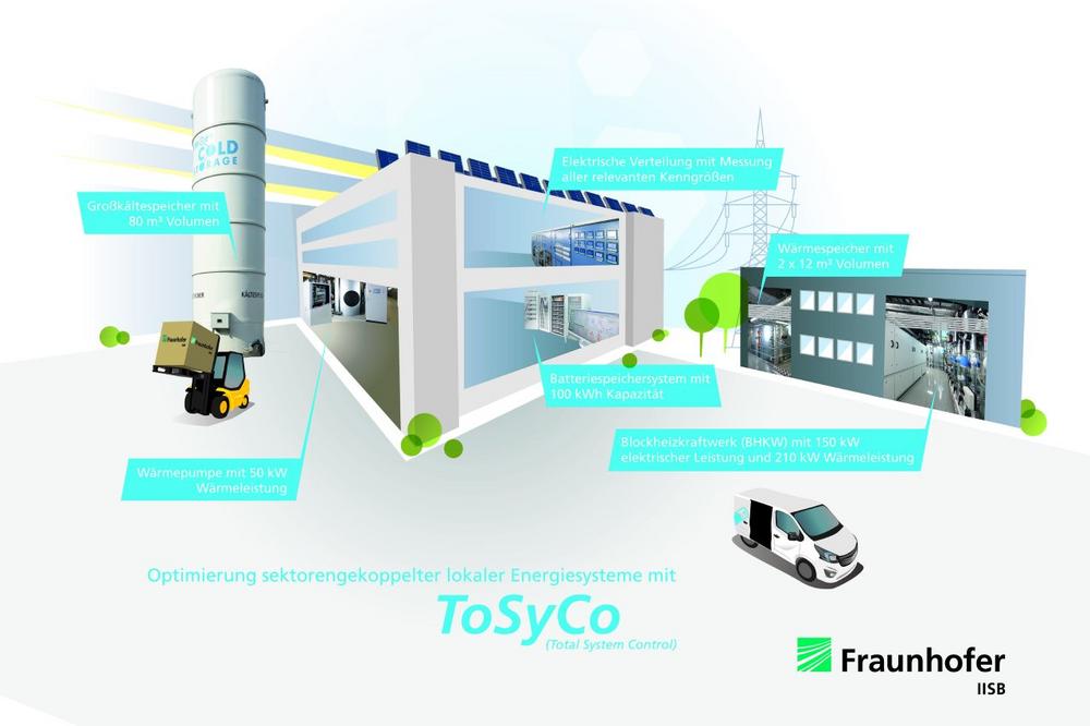 Mit Hilfe der Plattform TotalSystemControl (ToSyCo) zur Gesamtsystemsteuerung werden Zusammenhänge zwischen den (Teil-)Systemen identifiziert, intelligente Betriebsstrategien entwickelt und Optimierungsmaßnahmen validiert. Als Framework für ToSyCo wird ein Energiemonitoringsystem genutzt, in welchem alle energierelevanten Daten zusammenlaufen. Es wurden verschiedene Anlagen aus dem Reallabor für dezentrale Energiesysteme am Fraunhofer IISB in ToSyCo integriert: Ein Batteriespeichersystem mit einer Kapazität von 60 kWh (aktuell Ausbau auf 100 kWh), ein Großkältespeicher mit einem Volumen von 80 m³, ein Blockheizkraftwerk (BHKW) mit einer elektrischen Leistung von 150 kW und einer Wärmeleistung von 210 kW, zwei Wärmespeicher mit jeweils 12 m³ Volumen sowie eine Wärmepumpe mit einer Wärmeleistung von 50 kW. Die zukünftige Integration weiterer Anlagen, wie eine Redox-Flow-Batterie, ist bereits geplant und vorbereitet.