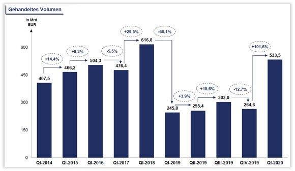 Das erste Quartal dieses Jahres hat vor dem Hintergrund der durch die Corona-Krise ausgelösten außergewöhnlich starken Bewegungen an den Kapitalmärkten einen deutlichen Anstieg bei den Handelsaktivitäten deutscher Anleger mit CFDs (Contracts for Difference) gezeigt. Unter anderem zu diesem Ergebnis kommt die jüngste Studie des CFin-Research Center for Financial Services aus München, das im Auftrag des Contracts for Difference Verband e.V. (CFD-Verband) regelmäßig Daten bei deutschen CFD-Anbietern erhebt. So hat das Volumen aller im ersten Jahresviertel 2020 durchgeführten Transaktionen mit Differenzkontrakten insgesamt 533,5 Mrd. Euro betragen, das entspricht einem Zuwachs von knapp 117 Prozent gegenüber dem Vorjahresquartal (245,8 Mrd. Euro).