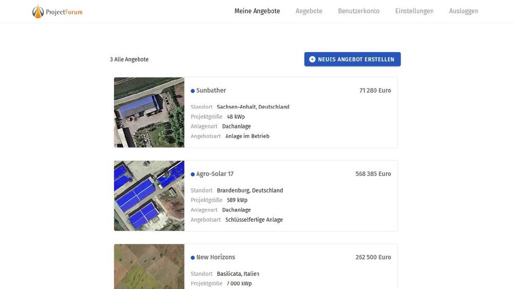 Die Renewables Now GmbH entwickelt und betreibt den internationalen und professionellen Online-Marktplatz für Photovoltaik-Projekte und Solarinvestitionen www.project-forum.com (kurz: ProjectForum). Die zugangsbeschränkte und hochautomatisierte Handelsplattform ist die direkte Schnittstelle zwischen Projektentwicklern, Generalunternehmern und Investoren. Klar strukturierte Angebotsbeschreibungen, umfangreiche Datenräume, ein hohes Maß an Nutzerfreundlichkeit, nutzerspezifische Zugangsbeschränkungen sowie interne Plausibilitätsprüfungen ermöglichen effiziente und kostengünstige Transaktionen zwischen den verschiedenen Marktteilnehmern. Das Team von ProjectForum besteht aus Ingenieuren für erneuerbare Energien, Softwareentwicklern und Betriebswirten. Es verfügt einerseits über langjährige Erfahrungen in der Planung, Umsetzung und Betriebsführung von Solarkraftwerken und andererseits in der Konzeptionierung und Programmierung effizienter Webapplikationen. Das in 2020 neu gegründete Unternehmen hat seinen Sitz in Hamburg und führt die Aktivitäten des ursprünglich in 2011 gestarteten Online-Marktplatzes in erweitertem Umfang fort.