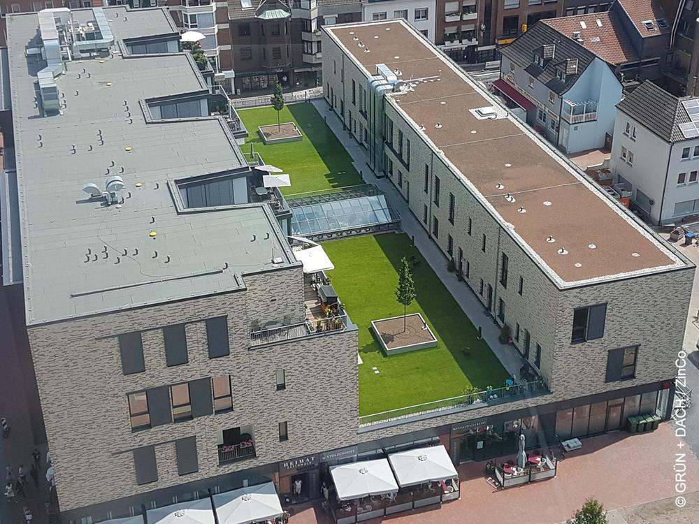 Eine Spiel- und Liegewiese mitten in der Stadt und dann noch auf einem Dach, wie geht das? Das ehemalige Hertie-Kaufhaus in Lünen erhielt im Rahmen seines Umbaus zu einer modernen Wohn- und Geschäftsimmobilie einen gänzlich neuen Baukörper. Durch einen „tiefen Schnitt“ in das vormals quaderförmige Gebäude entstand eine rund 850 m² große begrünte Dachfläche. Dafür war der ZinCo-Systemaufbau „Dachgarten mit Aquatec®“ dank seiner geringen Aufbauhöhe ideal und wurde vom Dachgärtner GRÜN+DACH fachgerecht eingebaut.