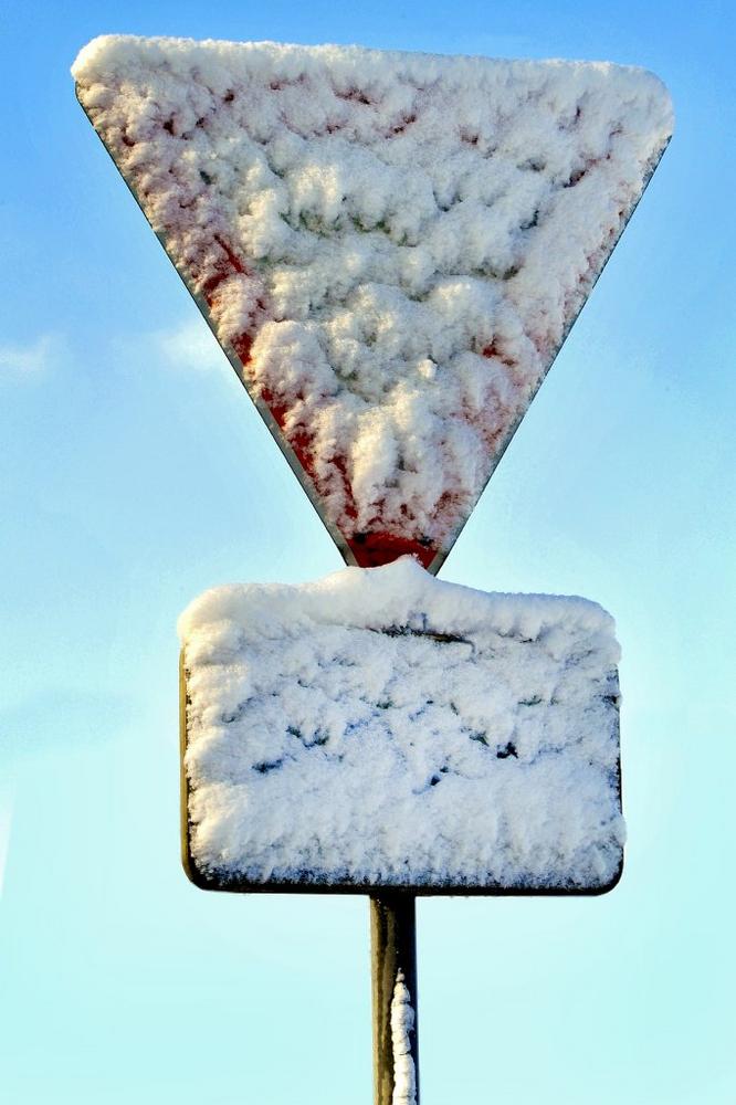 Zugeschneite Schilder – Wichtige Verkehrsschilder müssen nach der gängigen Rechtsprechung auch in überzuckertem Zustand beachtet werden, und zwar, wenn sie eine charakteristische Form haben, wie das achteckige Stoppschild (Zeichen 206) oder das auf der Spitze stehende Dreieck für „Vorfahrt gewähren“ (Zeichen 205).
