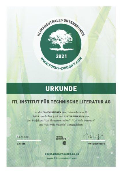 2019 ist itl der „Allianz für Entwicklung und Klima” beigetreten und hat anschließend von der Firma „Fokus Zukunft” die CO2-Emmisionen ermitteln und für 2019 und 2020 kompensieren lassen.