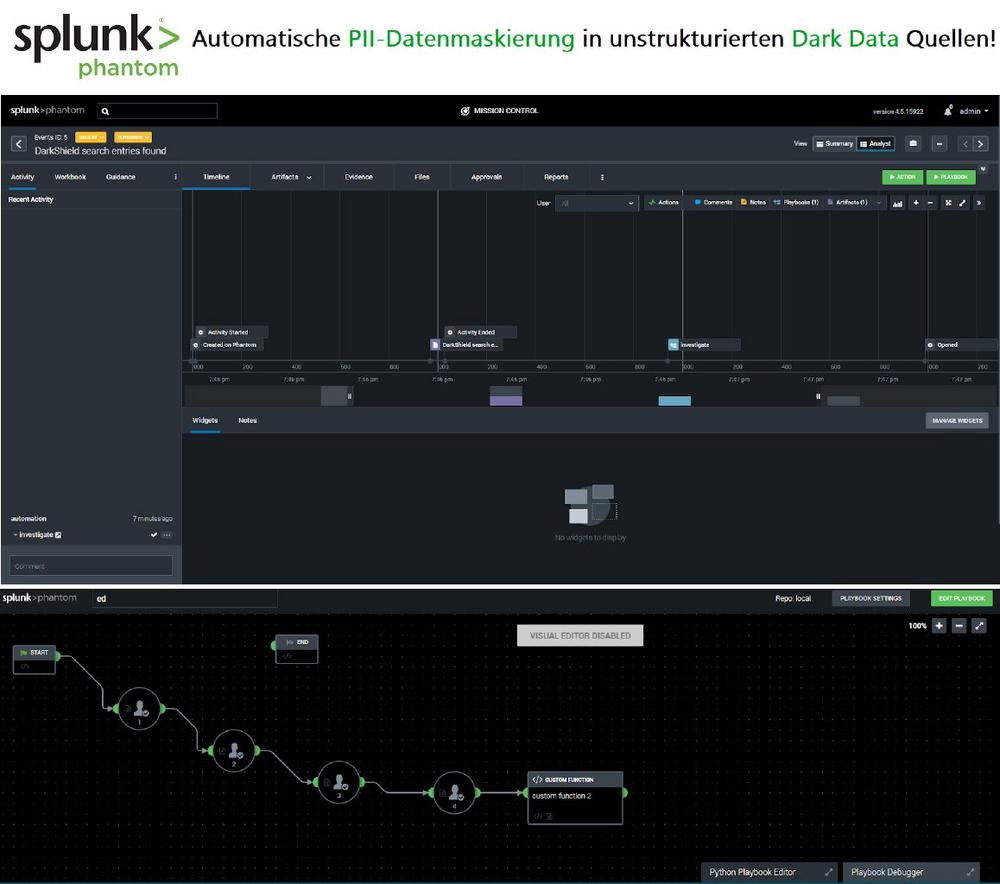 Damit ist es nun möglich, Sicherheitsreaktionen auf PII-Schwachstellen in Dark Data zu automatisieren, die bei DarkShield PII-Suchen aufgedeckt wurden. Konkret kann Phantom automatisch DarkShield ausführen, um diese Lücken durch Playbooks zu schließen, die Splunk zur Auswertung der von DarkShield gefundenen Daten verwenden. Vergleichen Sie dies mit dem Senden einer Alarm-E-Mail, wie in unserem früheren Artikel über die Verwendung des Splunk Adaptive Response Framework mit DarkShield beschrieben.