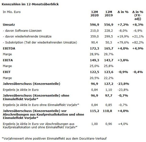 "Dank der schnellen Anpassung an die neuen Gegebenheiten, eines krisenresistenten Geschäftsmodells und einem vorsichtigen Kostenmanagement haben wir das letzte Jahr erfolgreich gemeistert," so Dr. Axel Kaufmann, Sprecher des Vorstands und CFOO. "Mit unserer sehr guten regionalen und kundenseitigen Positionierung sowie dem kontinuierlich steigenden Anteil wiederkehrender Umsätze haben wir die Grundlagen geschaffen, im Jahr 2021 weiter zu wachsen und gleichzeitig eine attraktive Profitabilität auszuweisen. In den kommenden Jahren werden die klaren Vorteile aus der stärkeren Umstellung auf Subskription und Cloud zur Wertschöpfung beitragen und unser Wachstum deutlich beschleunigen", so Kaufmann weiter.