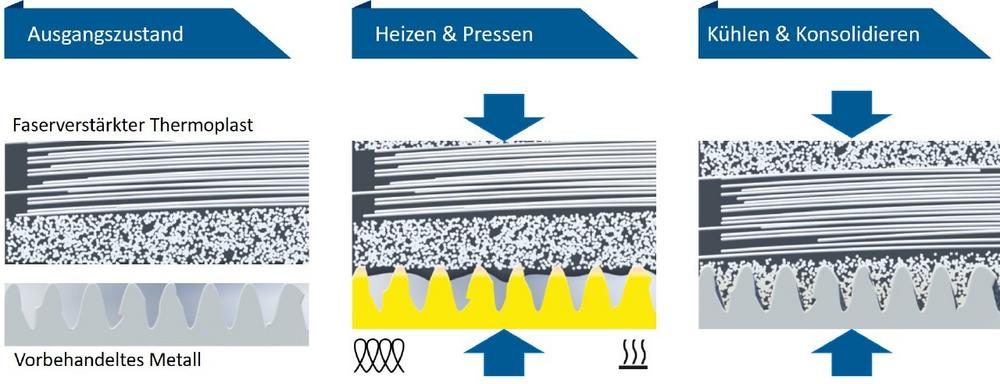 Im Forschungsvorhabens werden Fügeverfahren basierend auf Induktion und Einsatz von keramischen Hochrate-Heizelementen untersucht. Die Schwerpunkte der Vorbehandlungstechniken bilden z. B. Laserstrukturierung und Plasmaverfahren zur Oberflächenmodifizierung der Fügepartner. Diese Strukturierung der Metalloberfläche ermöglicht dabei eine Festigkeitssteigerung durch Verzahnung von Metall und Kunststoff. Mit Plasmabehandlung wird untersucht, ob die häufig schwachen physikalischen Wechselwirkungen zwischen Metall und Kunststoff gezielt verstärkt werden können. Die Festigkeit der hergestellten Verbindungen wird im Vergleich mit alternativen Fügemethoden getestet, insbesondere dem Kleben, und schließt u. a. eine notwendige hohe Temperaturwechselfestigkeit ein.