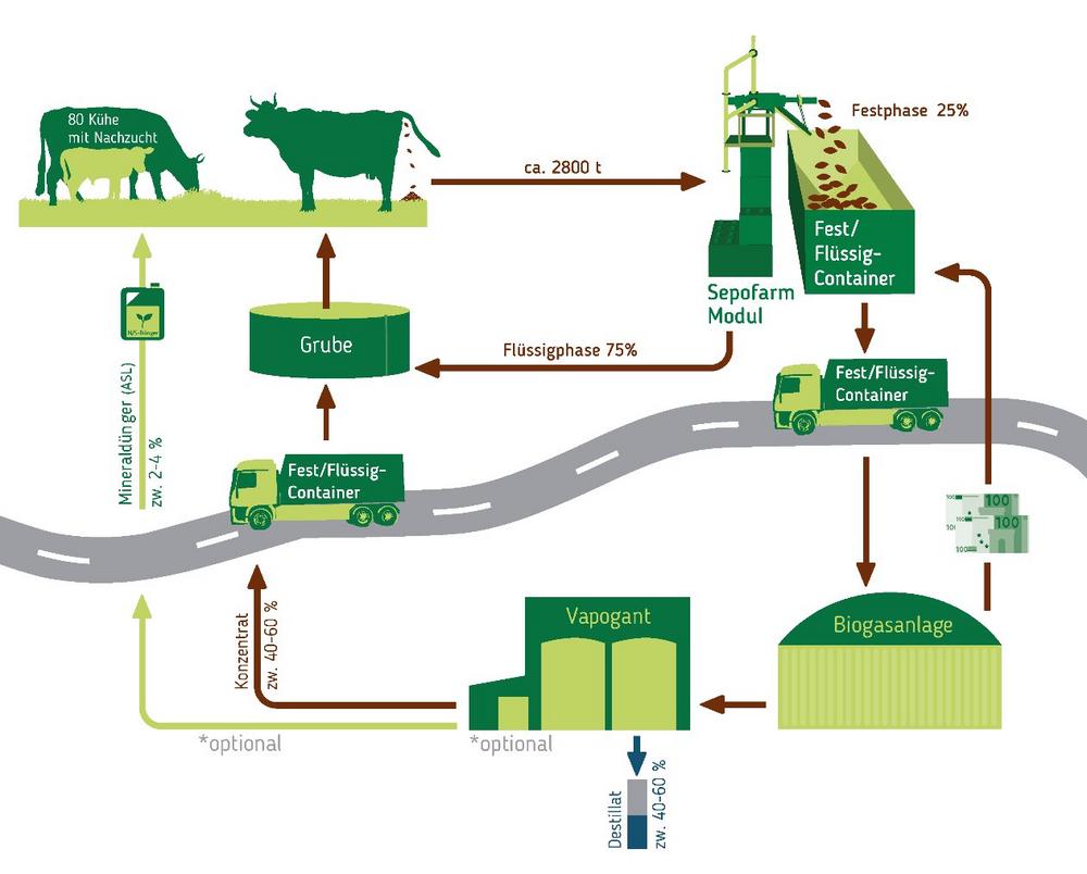 Während der Verdampfung in der Gärrestverdampfung „Vapogant“ entstehen drei Endprodukte: Wasser bzw. Destillat, welches vernebelt oder eingeleitet werden kann, eingedicktes Konzentrat, in welchem nahezu kein Ammoniumstickstoff mehr enthalten ist, und eine Ammoniumsulfatlösung (ASL), welches als Mineraldünger wieder auf die Felder ausgebracht werden kann. Das eingedickte Konzentrat wird dann entweder in das Gärrestlager der Biogasanlage oder in die Grube des Landwirtes transportiert und in einem weiteren Schritt auf die Felder ausgebracht. Dieser Kreislauf, in welchen der „Vapogant“ mit eingebettet ist, stellt sicher, dass stets Dünger zur Verfügung steht, mit welchem effizient gedüngt werden kann. Vor allem durch den modularen Separator „Sepofarm Modul“, welcher aus einem Separator sowie einem leicht transportierbaren Container (Hakenlift) besteht, ist es für den Landwirt möglich die Gülle ohne große Lagerungszeiten zeitnah auf seinem Hof zu verarbeiteten und den frischen Feststoff in einer Biogasanlage zu nutzen.