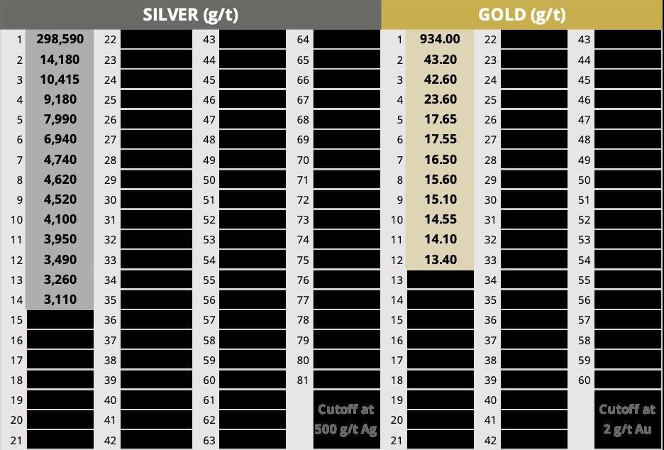 Die Gesteinsschürfproben auf dem Projekt Curibaya ergaben Gehalte von bis zu 298.000 g/t Silber und 934 g/t Gold, wobei die Proben über ein 4 x 5 km großes Alterationssystem verteilt sind. Die Highlights der Gesteinsschürfproben sind in Tabelle 1 und Abbildung 1 dargestellt.