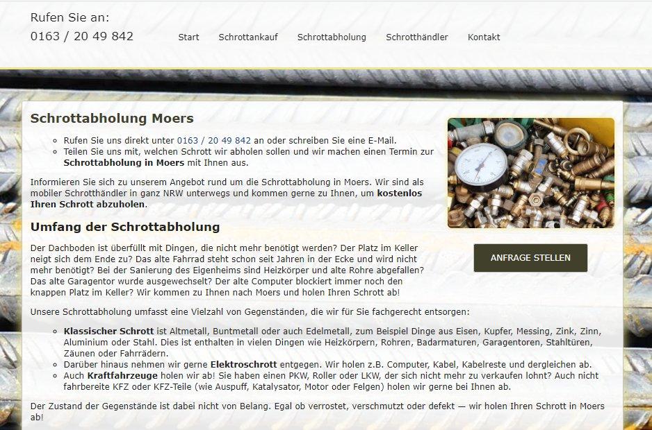 Die Schrottabholung Moers kauft Schrott aller Art bei seinen privaten und gewerblichen Kunden in Moers und dem gesamten Ruhrgebiet an. Er ist in der Lage, den Unternehmen die entsprechenden Nachweise zur Verfügung zu stellen und kümmert sich im Nachgang an den Schrott-Ankauf beziehungsweise die Schrottabholung um die fachgerechte Sortierung und Verbringung zu den Wiederaufbereitungsanlagen.