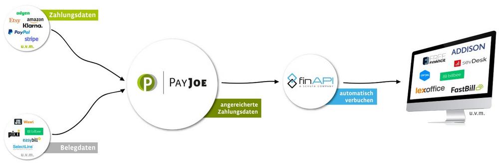 sämtlicher Banken und Finanzdienstleister direkt in ihr System einzulesen. Auch PayJoe ist an finAPI angebunden, sodass die Zahlungsdaten aller gängigen Onlineanbieter direkt in Ihrem