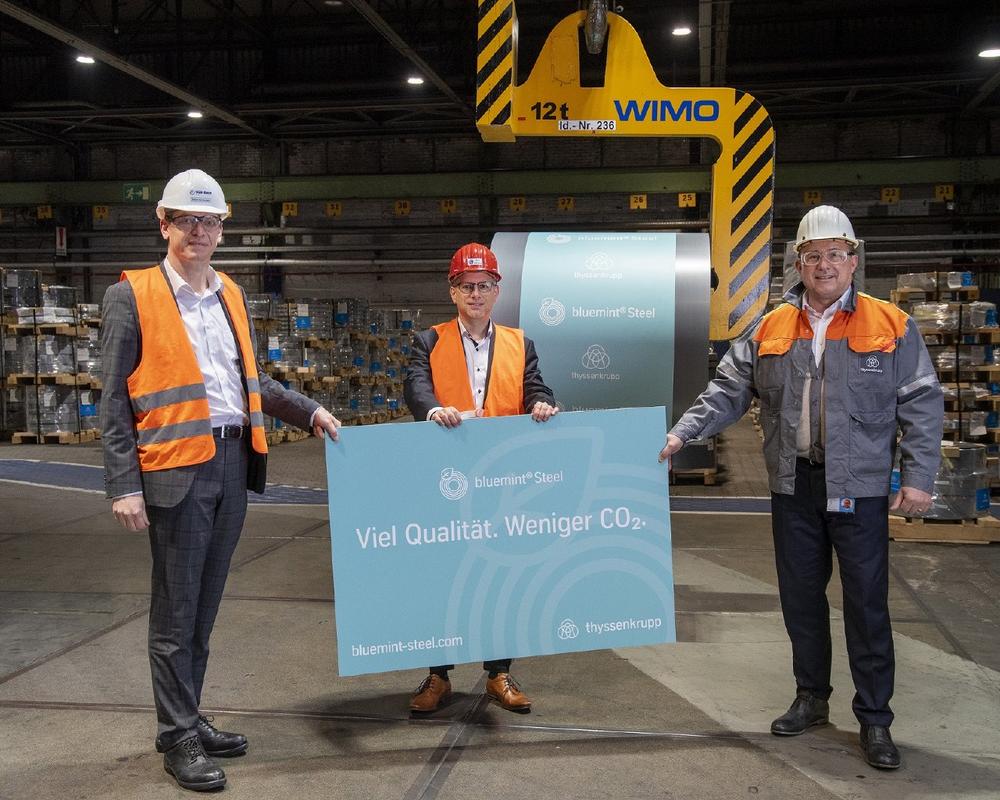 Seit Oktober 2021 bietet thyssenkrupp Steel zertifizierten CO2-reduzierten Stahl unter dem Markendach bluemint® an. Produziert wird zunächst über die klassische Hochofenroute am Standort Duisburg, bevor ab 2025 der Technologiesprung zur wasserstoffbasierten Direktreduktionstechnologie erfolgt.
