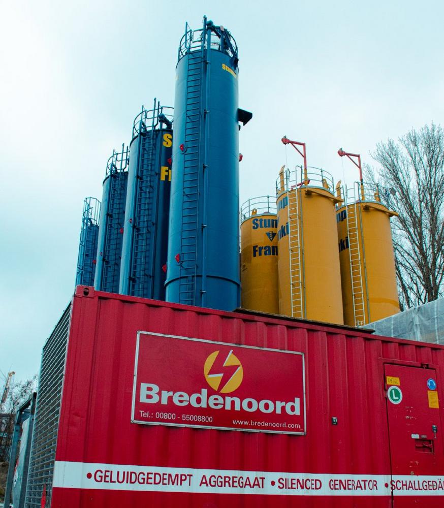 Die Stützsuspension besteht im Wesentlichen aus Bentonite und Wasser und wird direkt auf der Baustelle angemischt. Die hierfür erforderliche Mischanlage benötigt Strom, welcher ursprünglich über eine Netzlösung des örtlichen Stromanbieters abgedeckt werden sollte. Dieser konnte die erforderliche Leistung jedoch nicht rechtzeitig bereitstellen, weshalb Bredenoord die notwendige Energie in Form eines 500 kVA Stromaggregates inklusive externem 5.500 Liter Tank lieferte. Neben der Mischanlage konnte auch die Anlage zur Entsandung der Suspension zuverlässig mit Energie versorgt werden. Der Punkt Zuverlässigkeit war für den Spezialtiefbauer Stump-Franki besonders wichtig, da die Produktion einer Schlitzwand in einer bestimmten Zeit abgeschlossen werden muss. Die Anlage muss in dieser Zeit durchgängig laufen, eine unterbrechungsfreie Stromve rsorgung gewährleistet sein.