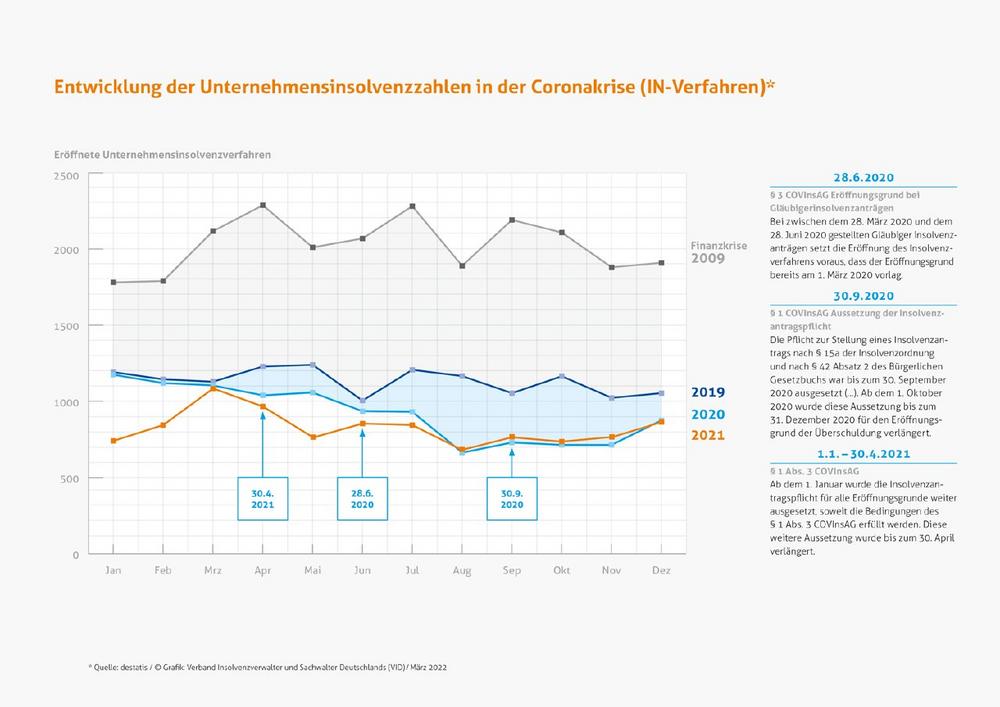 ** Grafik des VID: Entwicklung der Unternehmensinsolvenzzahlen in der Coronakrise (IN-Verfahren), © Verband Insolvenzverwalter und Sachwalter Deutschlands (VID)/März 2022, Grafik kostenfrei nutzbar