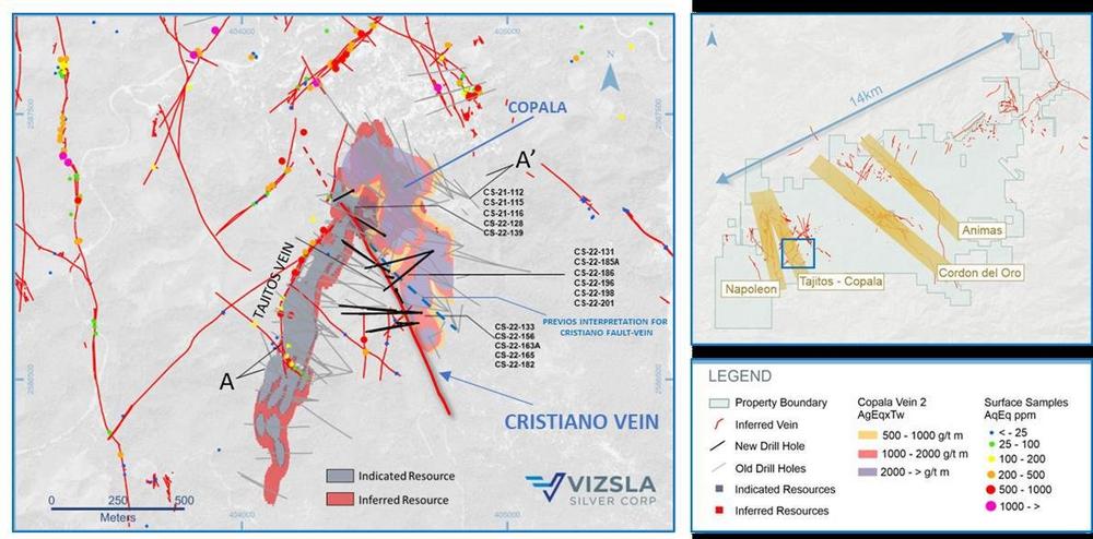 Die Ader Cristiano wurde ursprünglich bei der Erkundung der Adern Tajitos entdeckt, wo die Bohrungen die gut mineralisierte, NW-SE verlaufende Verwerfung durchschnitten. Die laufenden Bohrungen haben nun zu neuen Beobachtungen und Interpretationen geführt, die es den Geologen von Vizsla ermöglichen, Bohrlöcher zu planen, die speziell darauf ausgerichtet sind, Cristiano entlang des Streichs und in der Tiefe zu erkunden. Im Nordwesten durchschneidet Cristiano die Ader Tajitos und versetzt sie, was darauf hindeutet, dass Cristiano nach der Mineralisierung von Tajitos liegt und somit ein Bohrziel an der Fußwand von Tajitos darstellt (Abbildung 2). Darüber hinaus deuten offene Abschnitte in südöstlicher Richtung darauf hin, dass sich die Mineralisierung in dieser Richtung fortsetzt.