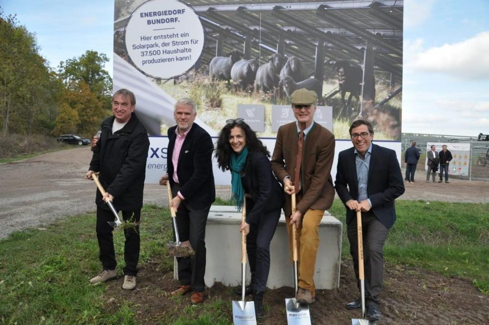 Foto: Bundorfs 1. Bürgermeister Hubert Endres, CSU-Landtagsabgeordneter Steffen Vogel, MaxSolar Prokuristin Elke Hanel, Flächeneigentümer Christian Freiherr Truchseß von Wetzhausen, und Pascal Lang (Vorstandsvorsitzender EGIS eG) beim Spatenstich am gestrigen Mittwoch (von links).