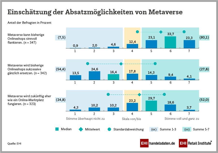 Im Metaverse würden mit 77,3 Prozent die meisten der befragten Händler auf die virtuelle Beratung zurückgreifen. 75,4 Prozent würden ihre Produkte dreidimensional präsentieren und 69,2 Prozent würden im virtuellen Raum auch Werbung schalten. Auch einer Erweiterung des stationären Einkaufs um virtuelle Erlebnisse durch VR-Brillen steht der Handel positiv gegenüber (67,9 Prozent).