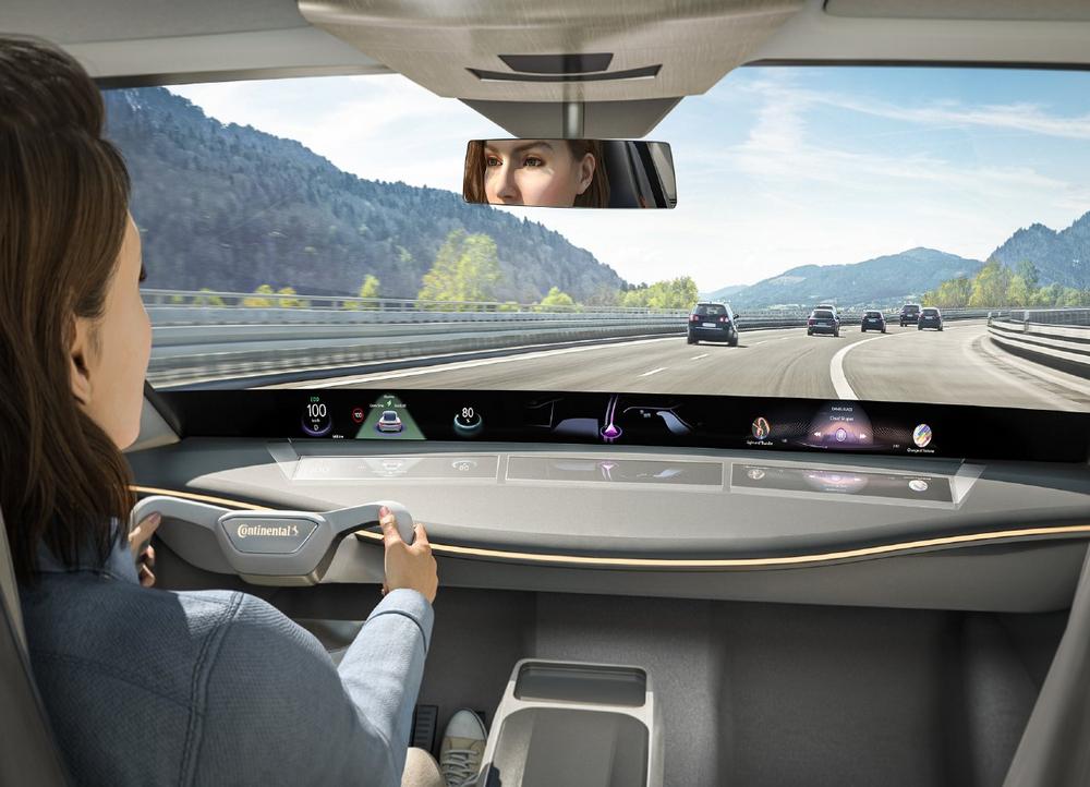 Head-up-Displays bieten bereits seit einigen Jahren den Vorteil, dass sie im Vergleich zu traditionellen Bildschirmen die Anzeige direkt in den Sichtbereich des Fahrers legen. Die unmittelbare Wahrnehmung auf der Blickachse des Fahrers schafft ein völlig neues Fahrerlebnis und kann die Fahrsicherheit erhöhen. Der Fahrer muss seinen Blick nicht mehr von der Straße abwenden, um Informationen zur Strecke, Geschwindigkeit, Batterie-Ladestatus etc. zu erfassen. Das steigert die Sicherheit und verhindert, dass die Augen des Fahrers durch eine ständige Anpassung der Sichtweite zwischen Bildschirm im Innern des Fahrzeugs und dem Straßenverkehr vor dem Fahrzeug ermüden. Bislang konnten Head-up-Displays, die die Anzeige in die Windschutzscheibe projizieren, in der Auflösung und Informationsfülle nicht mit den Anzeigeinhalten herkömmlicher Fahrzeugdisplays mithalten. Dieses Problem löst Continental mit einem durchgängigen Schwarzdruck am unteren Rand der Windschutzscheibe, der den Kontrast erhöht und die Sichtbarkeit auch bei intensiver Sonneneinstrahlung sicherstellt.