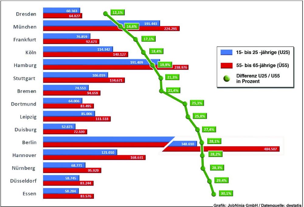 Die Online-Stellenbörse JobNinja (www.jobninja.com) wollte es genau wissen und nahm die 15 größten Städte in Deutschland unter dem Aspekt „Nachwuchslücke“ genauer unter die Lupe. Das Ergebnis zeigt ein sehr unterschiedliches Bild: