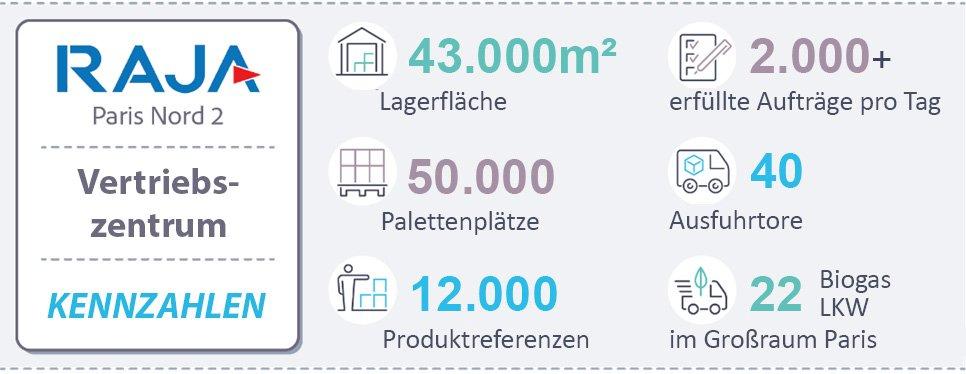 Die RAJA-Gruppe betreibt 15 Vertriebszentren in Europa, davon fünf in Frankreich, mit einer Gesamtfläche von 400.000 m2. Das Unternehmen gewährleistet europaweit Lieferungen innerhalb von 24 bis 48 Stunden, abhängig vom Zeitpunkt der Bestellung und dem Lieferort.