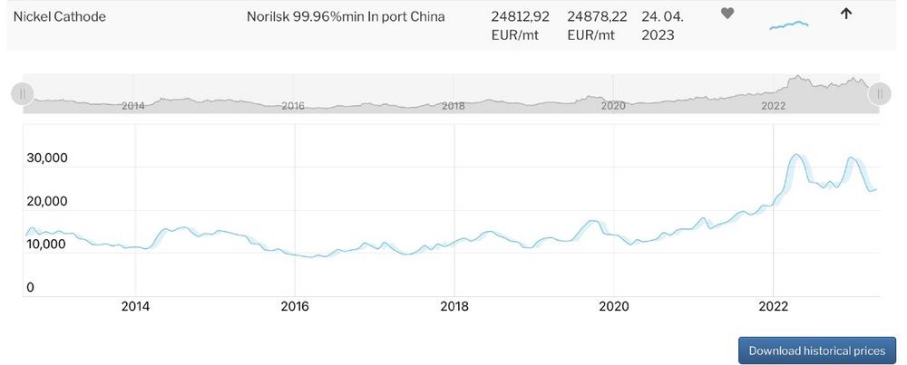 Preisverlauf von Nickelwire 0,025mm 99,98%. Nickel wire dieser Stärke wird für die neusten Generationen von Autobatterien verwendet. Quelle: https://ise-metal-quotes.com