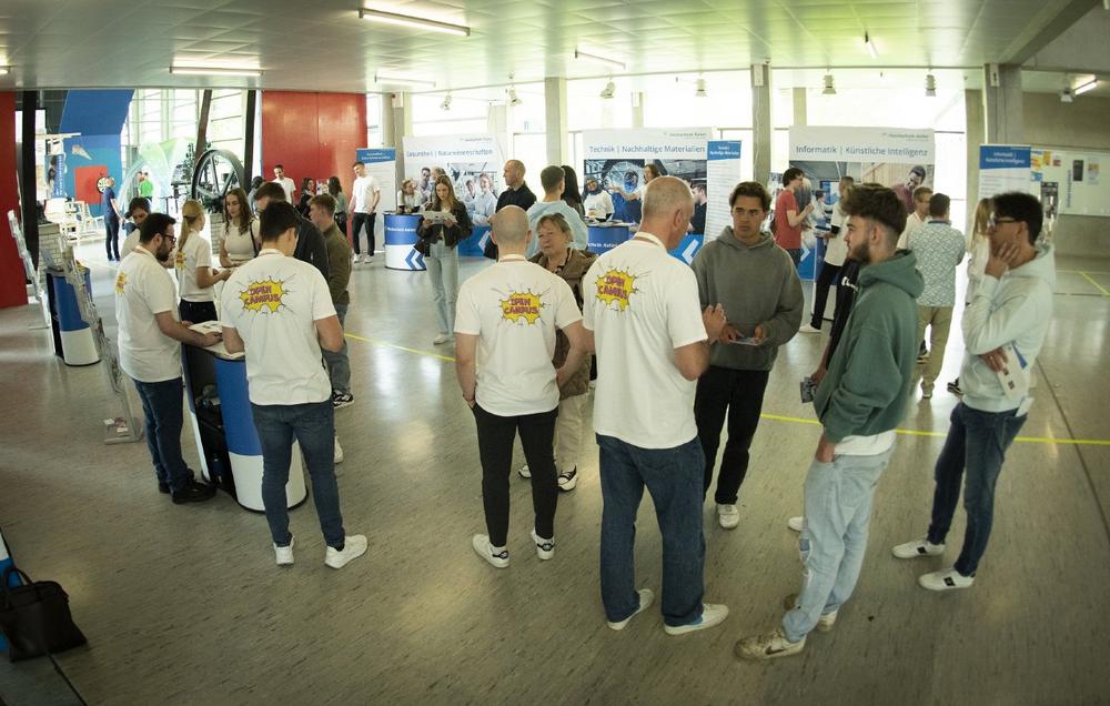 Im Foyer des Gebäudes an der Beethovenstraße empfingen die Fachbereiche Studieninteressierte mit ihren Studienangeboten. Zu Wirtschaft und Management, Gesundheit und Naturwissenschaften, Technik und Nachhaltige Materialien, Informatik und Künstliche Intelligenz sowie Design und Kommunikation gab es jede Menge praktischer Informationen. Ab 13 Uhr war in der Aula die Master-Area geöffnet, in der sich Interessierte über die vielfältigen Masterangebote der Hochschule Aalen informieren konnten.