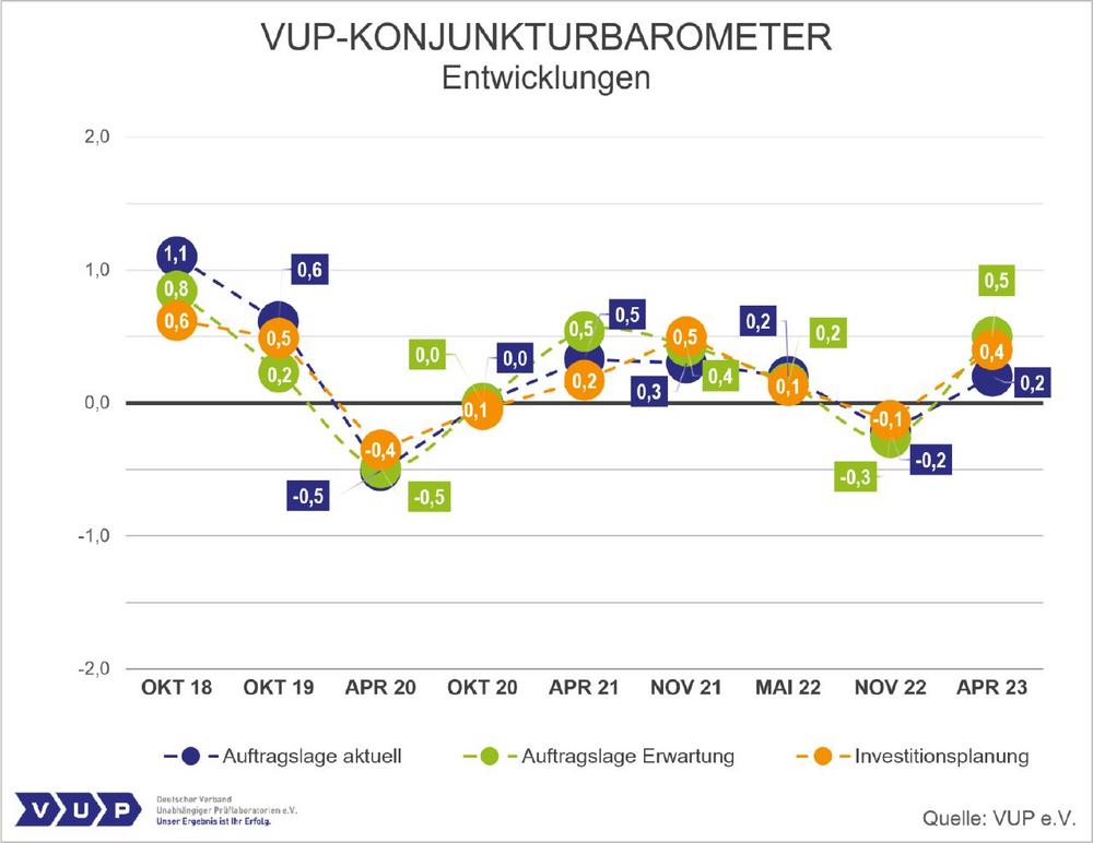 Das VUP-Konjunkturbarometer wird halbjährlich vom Deutschen Verband unabhängiger Prüflaboratorien (VUP) unter Prüf- und Kalibrierlaboratorien erhoben. Es soll eine Momentaufnahme der aktuellen Auftragslage der deutschen Laborbranche darstellen. Weitere Informationen zum VUP-Konjunkturbarometer und den Ergebnissen der letzten Ausgaben des VUP-Konjunkturbarometers finden Sie hier: