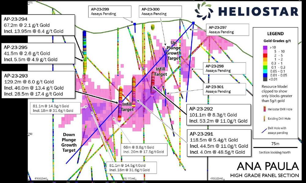Charles Funk, CEO von Heliostar, sagte: "Der Schlüssel zu unserer Vision für die Zukunft von Ana Paula ist die Definition einer hochgradigen, unterirdisch abbaubaren Goldmineralisierung. Die außergewöhnlichen Abschnitte des aktuellen Bohrprogramms untermauern diese Ansicht. Die Ergebnisse von Bohrloch AP-23-293 veranschaulichen das Potenzial mit einer 139%igen Steigerung des Gehalts im Vergleich zum aktuellen Ressourcenmodell, bei einem Cutoff-Gehalt von mehr als 5 g/t. Dieses Bohrloch füllt eine Lücke im historischen Modell. Es verbindet eine durchgehende 195 Meter lange Streichlänge von Bohrtreffern mit mehr als einer halben Unze Gold pro Tonne (15 g/t). Das Team vor Ort ist dazu übergegangen, als Nächstes das aufwärtsgerichtete Ziel zu erproben. Dieses Ziel hat das Potenzial, die Streichlänge des hochgradigen Panels zu erweitern.