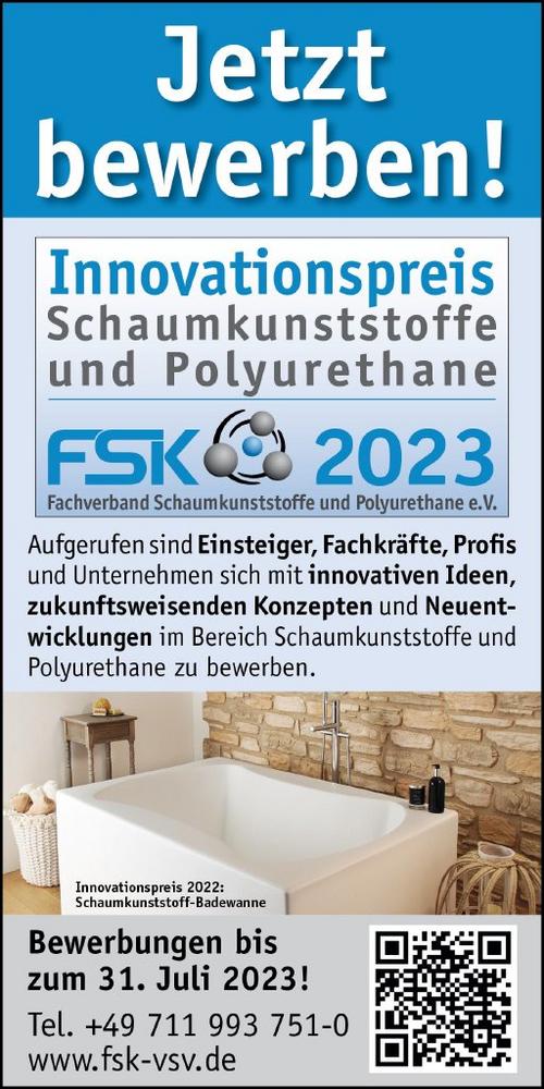 Der FSK schreibt den Innovationspreis in den Kategorien „Technologie“ und „Design und Gestaltung“ aus den Werkstoffbereichen Schaumkunststoffe und Polyurethane aus. In diesem Jahr bereits zum zweiten Mal ist auch eine Bewerbung mit Produkten und Innovationen mit Werkstoffbezug in der Kategorie „Nachhaltigkeit“ einzureichen. Einzelpersonen und Gruppen aus Hochschulen und Unternehmen aus ganz Europa können sich bis 31. Juli 2023 bewerben. Einreichungen von Nachwuchskräften und Profis bzw. Unternehmen werden getrennt bewertet und ausgezeichnet, um eine faire und sachgemäße Beurteilung und Prämierung nach Wissensstand und Erfahrung zu gewährleisten. Kriterien sind die Neuartigkeit und Innovationskraft der eingereichten Produkte und Lösungen, ebenso deren Markt- und Wettbewerbsfähigkeit. Bewerbungsunterlagen können [email=mailto:fsk@fsk-vsv.de]per Mail[/email] bei der Geschäftsstelle des FSK angefordert oder über dessen Website heruntergeladen werden. Die Preisverleihung findet im Rahmen der Internationalen FSK-Fachtagung Polyurethane und Schaumkunststoffe am 22. November 2023 in Leverkusen bei der Covestro Deutschland AG statt. Die SiegerInnen im Bereich der Nachwuchskräfte können zusätzlich Dotierungen von bis zu 3.000 Euro erhalten, um ihre Innovationen am Markt zu etablieren.