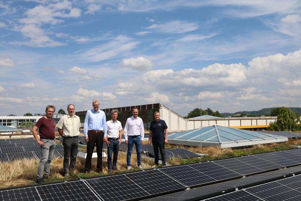 Hoch hinaus ging es zur Einweihung der Photovoltaikanlage, die auf dem Dach des Schulzentrums Ost in Schwäbisch Hall errichtet wurde. Oben angekommen erstrahlen die 1.174 Module. Seit März produziert die Anlage umweltfreundlichen Strom. Am 4. Juli wurde die Anlage offiziell von Schwäbisch Halls Oberbürgermeister Daniel Bullinger, dem Energiebeauftragten der Stadt, Heiner Schwarz-Leuser, den Projektverantwortlichen seitens der Stadtwerke Martin Menschl und Matthias Barie sowie den Rektoren der Gemeinschaftsschule und der Realschule Schenkensee, Friedrich Ortius und Urban Brändle, eingeweiht.