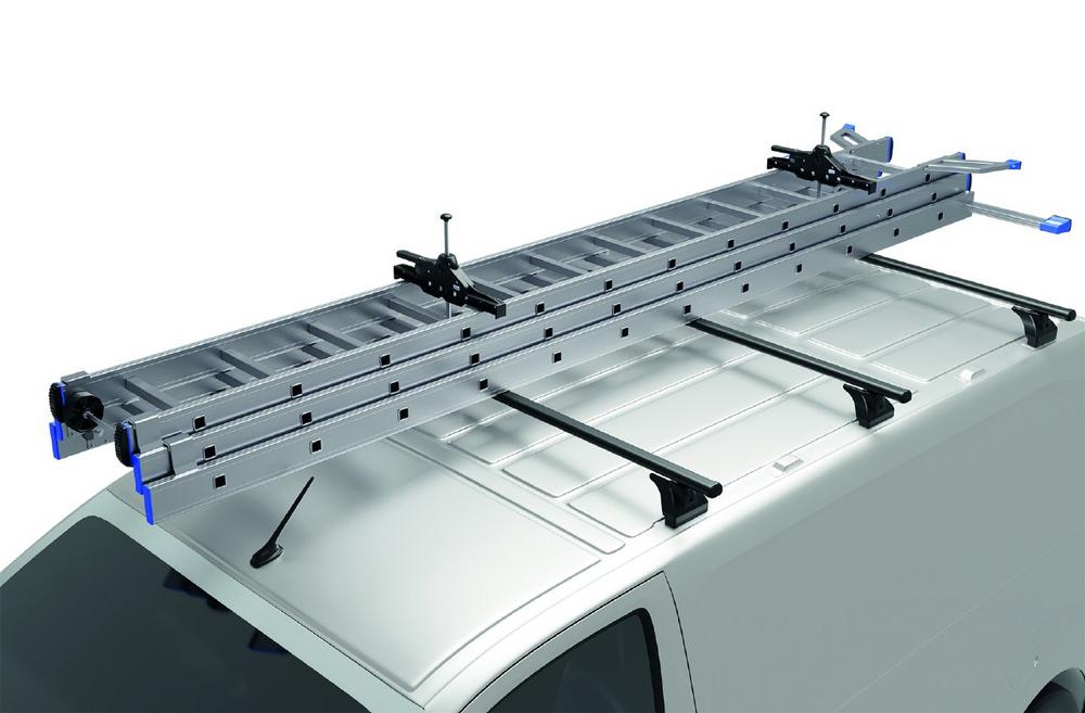 Das KRAUSE Leiterhalter-Set für Dachgepäckträger schafft hier Abhilfe. Die beiden einfach zu bedienenden Klemmen werden in den Dachgepäckträger eingehängt und auf die Höhe der zu transportierenden Leiternteile eingestellt. Je nach Holmbreite können so bis zu vier einzelne Leiternteile auf dem Dach befestigt werden. Nach der Ersteinstellung können die Dachklemmen durch Schnellverschlüsse fixiert und wieder gelöst werden. Das erleichtert die Handhabung und spart wertvolle Arbeitszeit. Beim Transport auf Sprintern kann die Ladungssicherung durch Zurrmittel in Form von Gurten, Ketten und Seilen erfolgen – die pragmatischere Lösung ist jedoch ein Leiterhalter, der das lästige Einfädeln von Befestigungsmitteln überflüssig macht und die Leitern einfach, sicher und schnell auf dem Träger fixiert. Um die Leitern vor Diebstahl zu schützen, können die Dachklemmen durch integrierte Schlösser mit Gleichschließvorrichtung verriegelt werden.