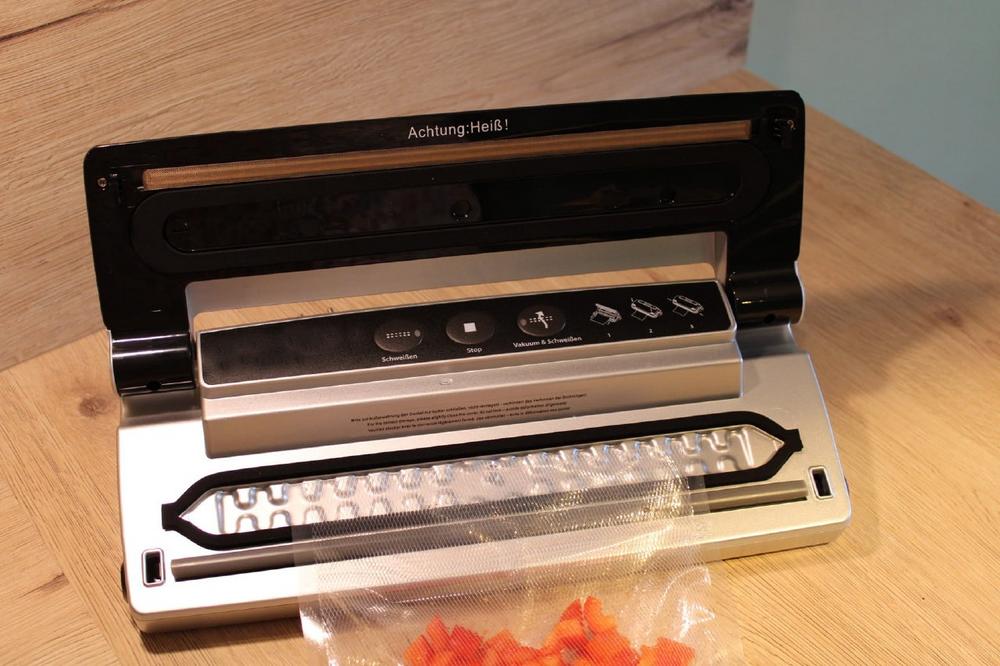 Eine Schweißnaht, die dicht hält, ist essenziell für die Haltbarmachung der Lebensmittel. Dafür sollte sie besonders breit und stabil sein. Arbeitet das Gerät beim Zuschweißen zuverlässig, reicht eine einfache Schweißnaht aus. Ist jedoch beim Befüllen etwas auf den Beutel gekleckert, wird die Schweißnaht an dieser Stelle nicht halten. Vakuumierer, die zwei oder drei Schweißnähte hintereinander anbringen, verzeihen solche Anfängerfehler eher. Bei Modellen, die nur einen Schweißdraht haben, können Nutzer den Beutel auch etwas herausziehen und manuell eine zweite Schweißnaht anbringen. - Der Flüssigkeitsabscheider