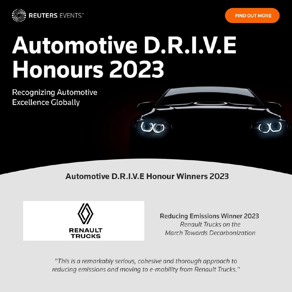 „Der Klimawandel ist die größte Herausforderung unserer Zeit. Es ist wichtig, dass wir als Nutzfahrzeughersteller Verantwortung übernehmen und dazu beitragen CO2-Emissionen zu reduzieren“, sagt der Geschäftsführer von Renault Trucks, Frederic Ruesche. „Unser größtes Ziel als Unternehmen ist die Dekarbonisierung, besonders durch unsere Elektro-Lkw. Wir sind davon überzeugt, dass das Verringern von Emissionen sowohl für unser Unternehmen als auch für unsere Gesellschaft von großer Bedeutung ist. Umso mehr freuen wir uns, dass wir für unsere Strategie zur Dekarbonisierung den Reuters Automotive D.R.I.V.E. Honours erhalten haben!“