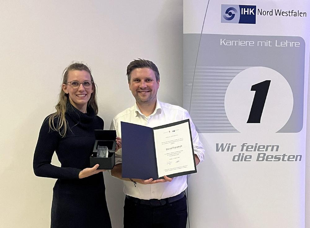 Daniel Fröndhoff begann im August 2020 seine Ausbildung für IT-System-Management bei der nicos AG. „2,5 Jahre später kann ich nun sagen: Ausbildung bestanden und das ‚sehr gut‘ sogar“, freut sich Daniel, der in Begleitung seiner „Ex-Chefin“ Julia Beck, HR Business Partner beim Münsteraner Netzwerkexperten nicos AG, „Die Besten“-Auszeichnung von der IHK Nord Westfalen entgegennehmen nehmen durfte.