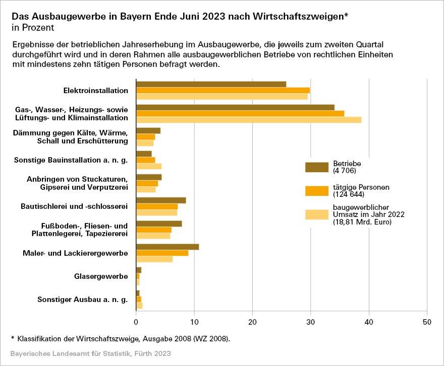 Schweinfurt. Im bayerischen Ausbaugewerbe sind Ende Juni 2023 insgesamt 4 706 Betriebe von rechtlichen Einheiten mit jeweils mindestens zehn tätigen Personen wirtschaftlich aktiv. Nach weiteren Angaben der Fachgruppe im Bayerischen Landesamt für Statistik umfasst der Personalstamm dieser Betriebe insgesamt 124 644 Beschäftigte. Bei 2,8 Prozent mehr Betrieben als vor Jahresfrist ist das ein Beschäftigtenzuwachs um 2,4 Prozent.
