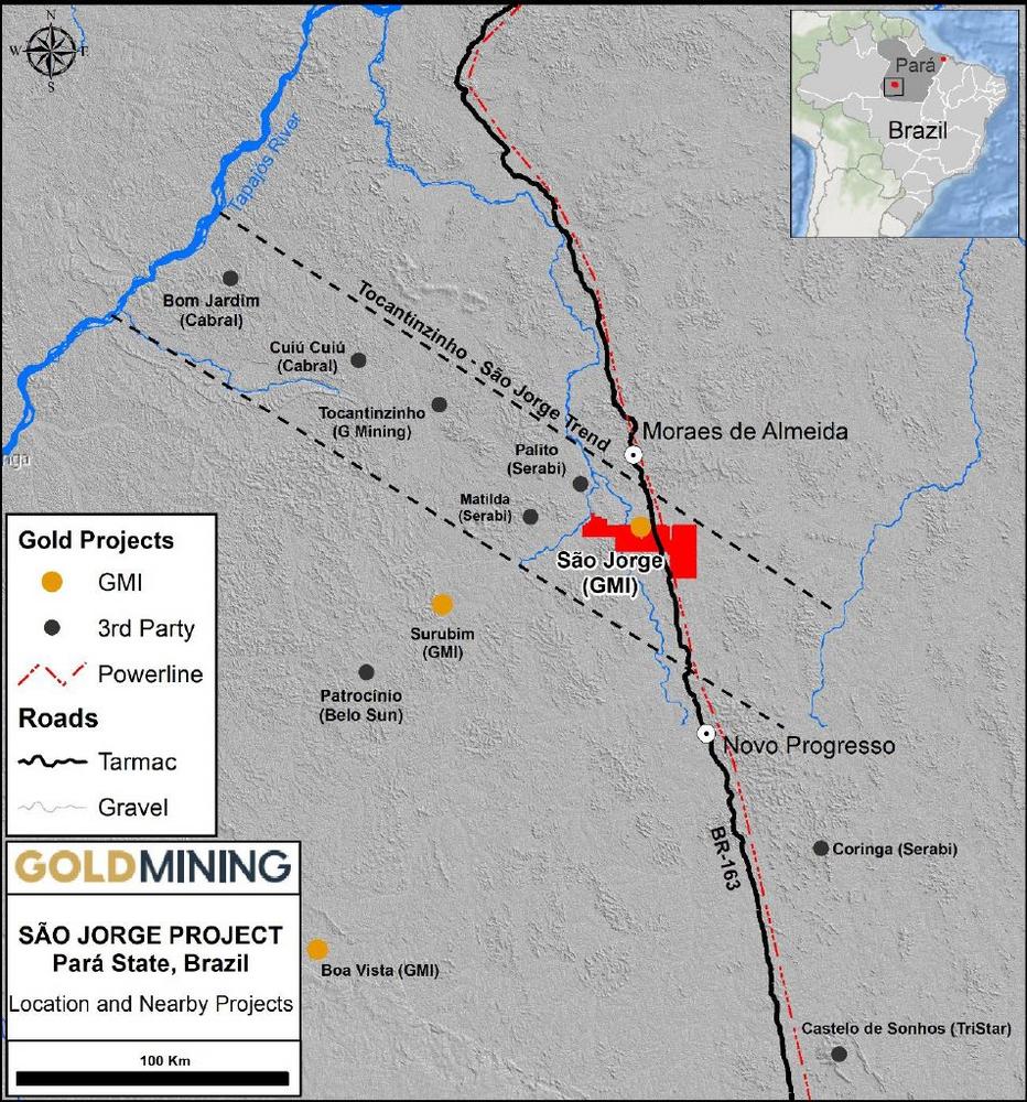 Das zu 100 % unternehmenseigene Projekt São Jorge befindet sich im Zentrum des aktiven und sich rasch entwickelnden Goldbezirks Tapajos. Die Region hat laut der brasilianischen Bergbaubehörde schätzungsweise über 20 Millionen Unzen Gold aus dem handwerklichen Abbau von Oberflächenlagerstätten produziert. Der nun asphaltierte Highway BR-163 hat die Hürden für die Erschließung traditionellerer Grundgesteinsminen in der Region verringert, einschließlich der produzierenden hochgradigen Untertage-Mine Palito von Serabi Gold plc. (Serabi") und des Tagebau-Erschließungsprojekts Tocantinzinho von G Mining Ventures Corp. (G Mining"), das Berichten zufolge bis zum 31. August 2023 zu mehr als 50 % fertiggestellt ist.