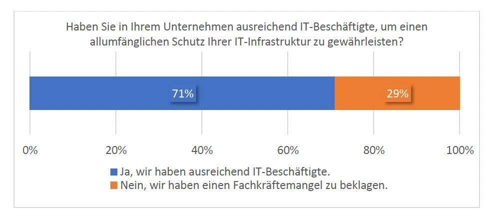 Die Größe des IT-Teams ein entscheidender Faktor für die Fähigkeit eines Unternehmens, sich gegen Cyberangriffe zu schützen und eine effiziente IT-Infrastruktur zu gewährleisten. Bei mehr als einem Viertel der befragten Unternehmen (27 Prozent), die über ausreichend IT-Personal verfügen, wird die IT-Infrastruktur von 21 bis 50 und bei 24 Prozent von 11 bis 20 IT-Beschäftigten verwaltet. Hiermit zeigt sich – wenig überraschend – dass mit der Unternehmensgröße auch die Anzahl der für die IT zuständigen Beschäftigten tendenziell zunimmt.