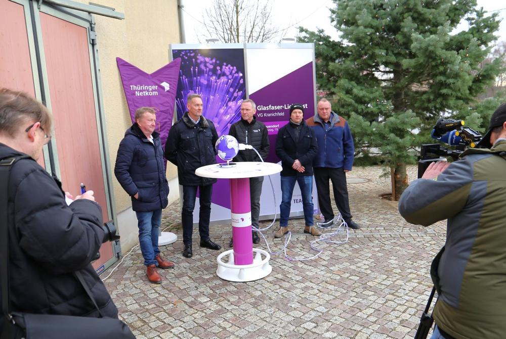 Bei dem symbolischen Lichtfest schalteten heute in Nauendorf der Vorsitzenden der Verwaltungsgemeinschaft, Fred Menge, und Netkom-Bereichsleiter Thoralf Luhn den ersten sogenannten Signalverteiler im neuen Glasfasernetz zu. Insgesamt waren bei dem Infrastruktur-Vorhaben 4,593 Millionen Euro investiert worden. Die Investitionssumme setzte sich dabei fast vollständig aus Fördermitteln von Bund und Land Thüringen zusammen. In den VG-Gemeinden Rittersdorf, Nauendorf, Hohenfelden, Tonndorf, Klettbach und Kranichfeld wurden hierbei über 181 Kilometer Glasfaserleitungen neu verlegt; dafür waren u.a. auf einer Strecke von 44 Kilometern Tiefbauarbeiten mit Grabenschachtungen sowie die Verlegung von 71 Kilometer Leerrohren erforderlich.