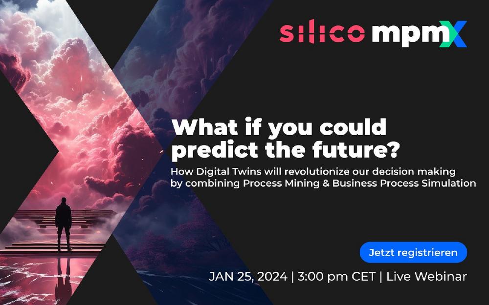 Im kommenden Live Webinar am 25. Januar 2024 erfahren Sie, wie mpmX in Kombination mit der Business Process Simulation Plattform von Silico ermöglicht, Zukunftsszenarien zu simulieren und deren Auswirkungen auf Prozessmetriken vorherzusagen. In einer Live Demo sehen Sie, wie die Kombination beider Tools kontinuierliche Prozessverbesserungen durch eine fundierte Entscheidungsfindung absichert.
