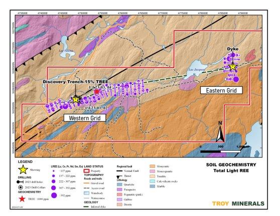 Im späten Herbst 2023 wurden auf dem Lac-Jacques (REE)-Konzessionsgebiet, das in der Nähe von St. Anne du Lac in der kanadischen Provinz Quebec liegt, 319 Bodenproben entnommen. Die geochemische Untersuchung wurde unter Anwendung von zwei Vermessungsrastern durchgeführt (Abbildung 1 und 2). Das westliche Raster, über und entlang des Streichens des Entdeckungsgrabens gelegen, testete 2,5 Kilometer des Streichens über eine Breite von 200 bis 300 Metern. Die Rasterlinien waren von 160° bis 180° orientiert (siehe Pressemitteilung vom 30. Oktober 2023), wobei Proben vom B-Horizont in Abständen von 25 Metern genommen wurden. Das östliche Raster wurde über einem Gangaufschluss ausgeführt, der in der Nähe der östlichen Grenze des Konzessionsgebiets liegt. Die Rasterlinien waren hierbei in Ost-West-Richtung ausgerichtet und deckten ein Gebiet von etwa 600 x 300 Metern ab, zentriert auf den Gangaufschluss (ebenfalls B-Horizont mit Abständen von 25 Metern).