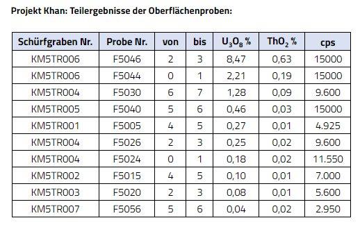 – Durchschnittlicher chemischer Analysewert der ersten 10 Proben beträgt 1,33 % U3O8